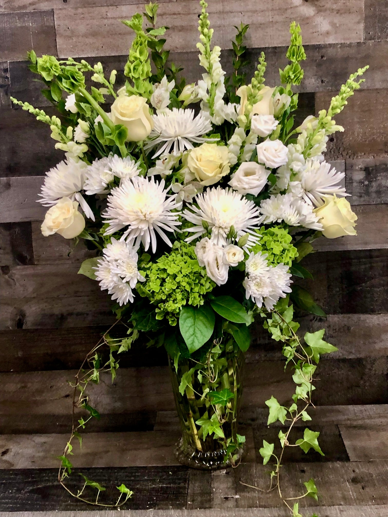A vase arrangement of white flowers with green hydrangea and bells of Ireland.